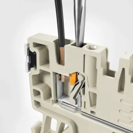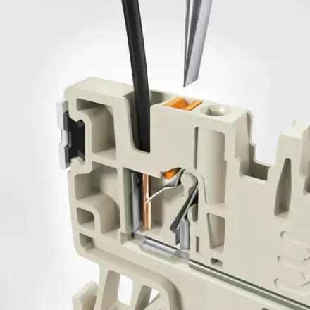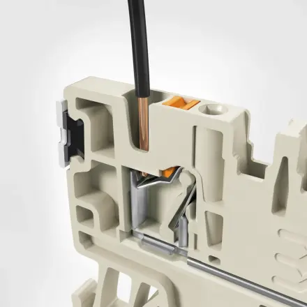 The conductor is simply inserted into the clamping point up to the stop. Once in position, the spring holds it like a barb without damaging it.