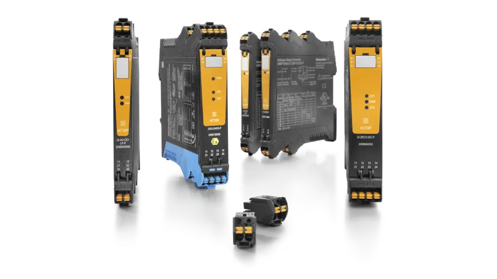 The versatile ACT20P signal converters enable reliable processing of analogue signals. They are ideally suited to the extensive requirements of the process industry and power engineering. Equipped with a display, FDT/DTM software or DIP switches, they ensure easy configuration – and the coded PUSH IN connectors prevent misconnections.